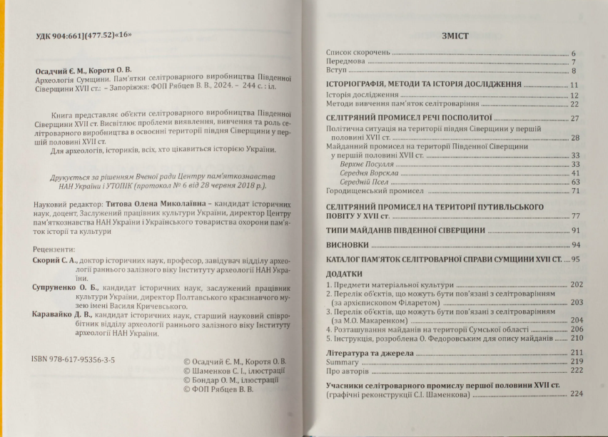 Книга представляє об’єкти селітроварного виробництва Південної Сіверщини XVII ст. (Переважно, в межах території сучасної Сумської області). Висвітлює проблеми виявлення, вивчення та роль селітроварного виробництва в освоєнні території півдня Сіверщини у першій половині XVII ст.