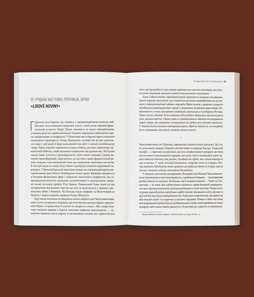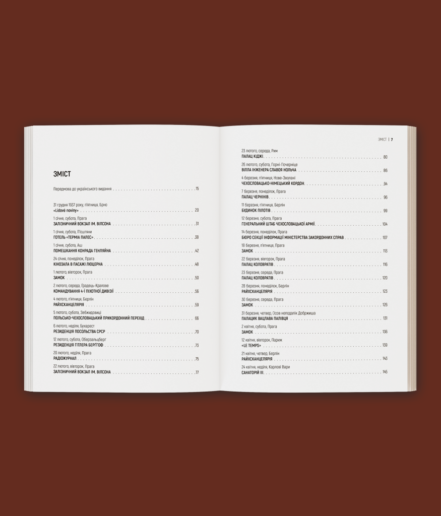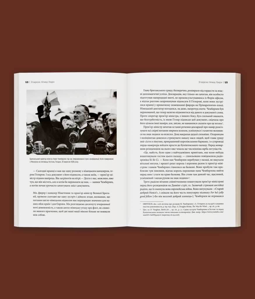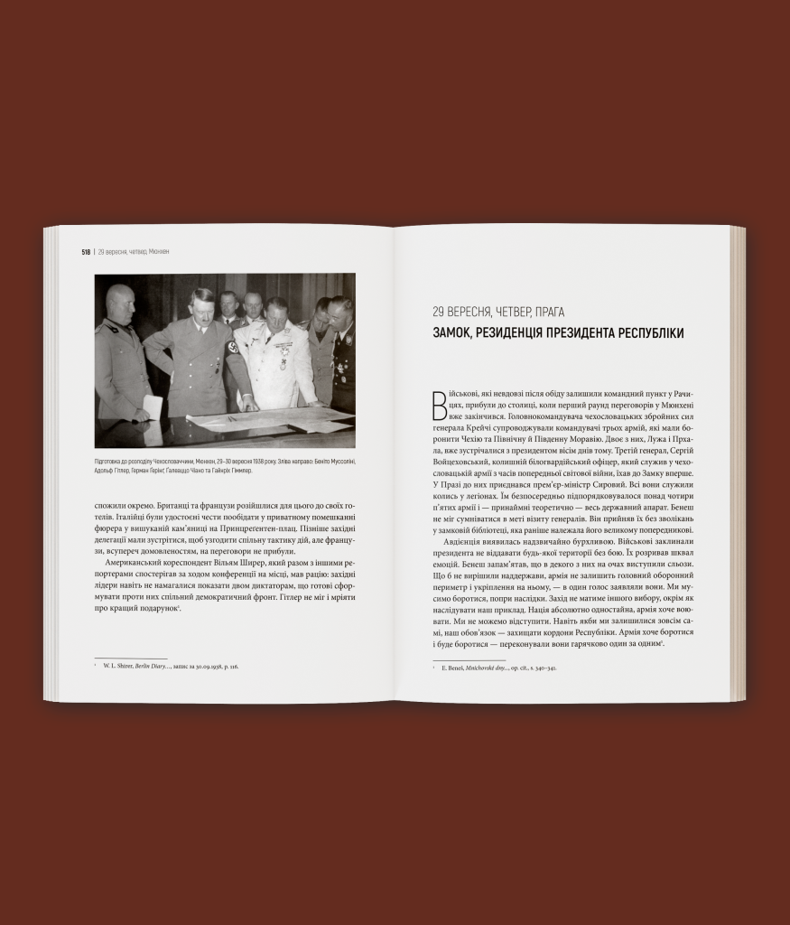Пйотр М. Маєвський майстерно аналізує міжнародну кризу, у яку світ занурився напередодні Другої світової війни. Ледь не щоденна реконструкція подій, надзвичайна увага до деталей, залаштункові розмови політиків у Празі, Берліні, Римі, Лондоні та деінде, протистояння розвідок, аналіз психотипів головних дійових осіб, їхня сила та безсилля витворюють динамічний сюжет, у якому напруга зростає із кожною сторінкою. Тут немає довгих розділів, оповідь радше нагадує щоденник, у якому кожен запис побудовано довкола важливих місць, людей та подій. Читач стає очевидцем і разом з протагоністами переживає увесь буремний 1938 рік, опиняючись у вирі політичного трилера, на жаль, з відомим фіналом.