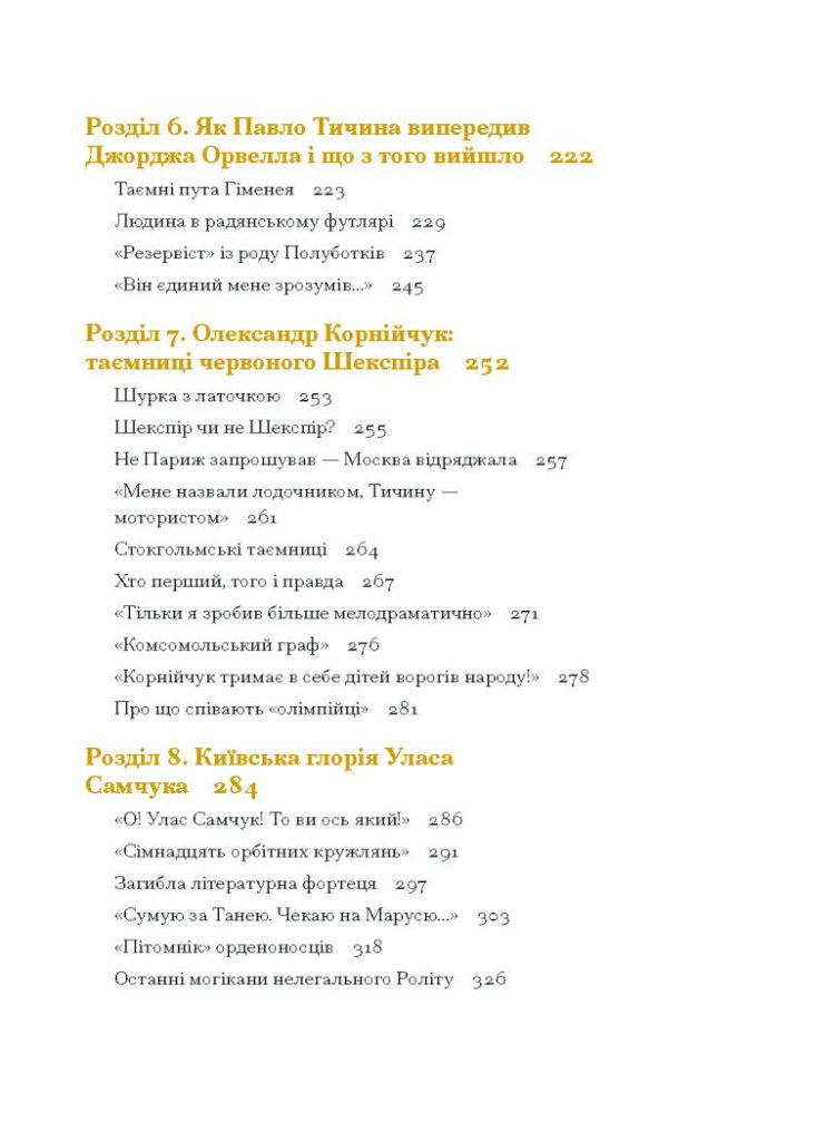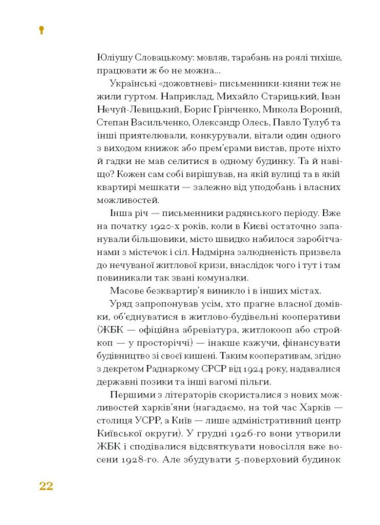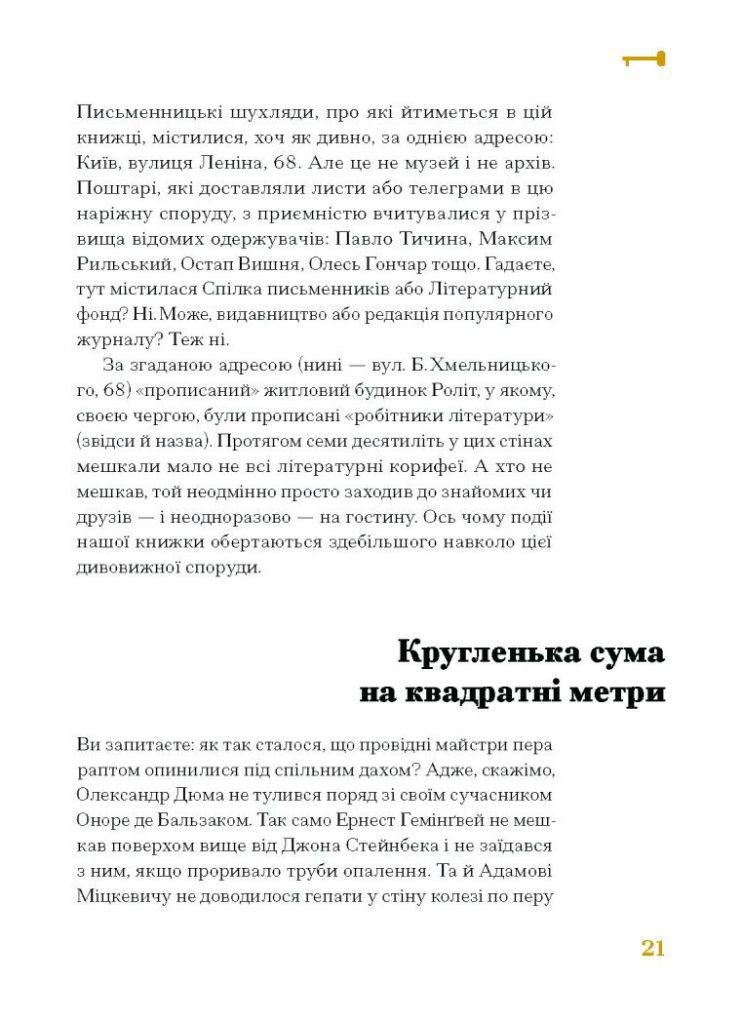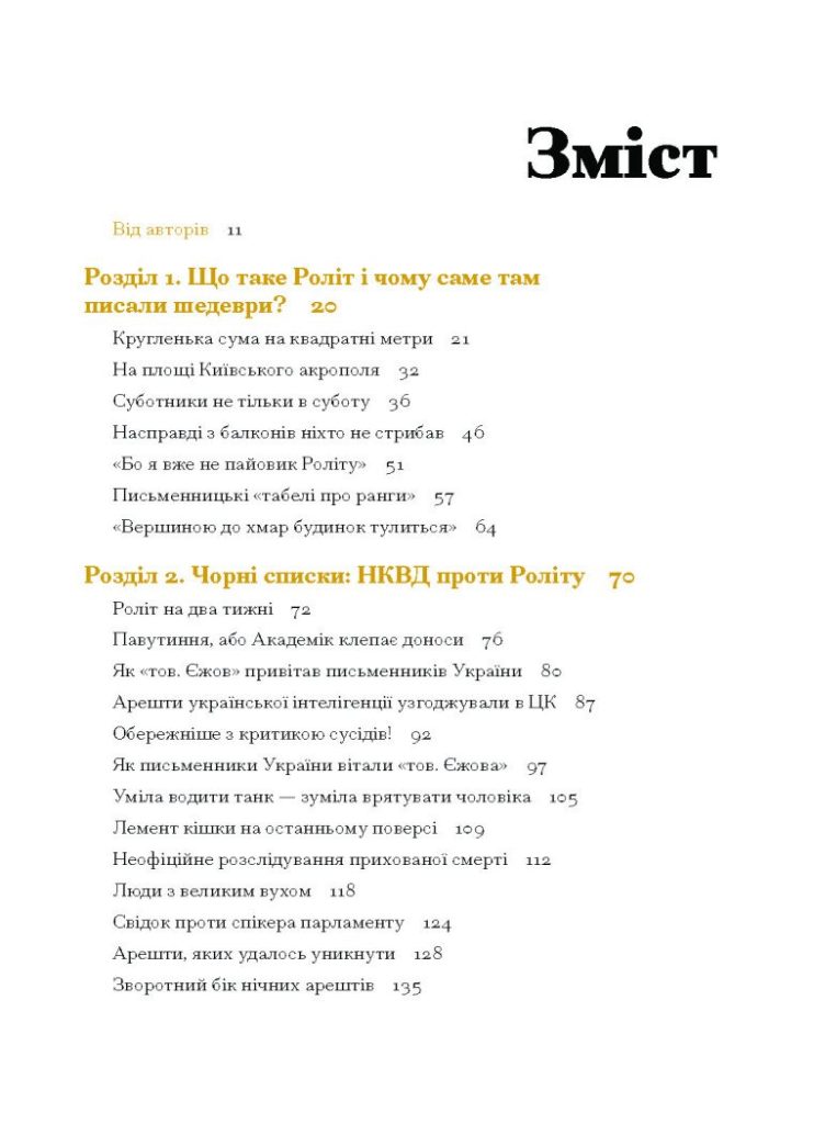 Події цієї документальної книжки розгортаються навколо київського будинку письменників Роліт. Саме тут мешкали або гостювали такі яскраві постаті української літератури ХХ ст., як П.Тичина, М.Рильський, М.Бажан, Ю.Яновський, І.Кочерга, Остап Вишня, О.Корнійчук, У.Самчук, О.Кундзіч, О.Гончар та інші. Герої книжки постають живими людьми зі своїми радощами та печалями, творчими злетами та падіннями, кумедними епізодами та життєвими драмами. Таємна співпраця з НКВД, вимушене фальшування автобіографій, труднощі професійної реалізації, плагіат як трамплін для кар’єри, знищення конкурентів за допомогою «адмінресурсу», гонорари й заборонені книжки, квартирне питання та взаємини з рідними — усе це реалії літературного повсякдення в країні здійсненої антиутопії. Розвідки спираються на маловідомі факти, виявлені в численних архівах чи записані з усних спогадів. Автори будують розповідь як захопливий детектив, розглядають різні версії, намагаючись разом із читачем проникнути в закулісні таємниці радянського літпроцесу. Для тих, кого цікавить історія, хай і неприкрашена, гірка, але правдива, а також усіх, хто любить українське письменство й прагне пізнати його глибше.