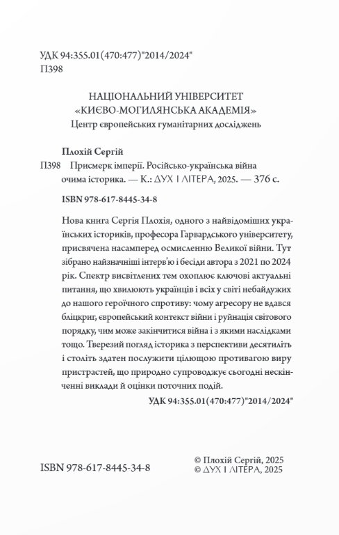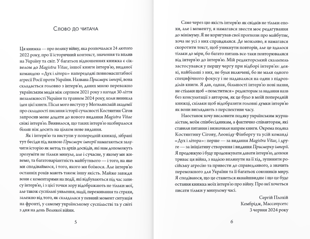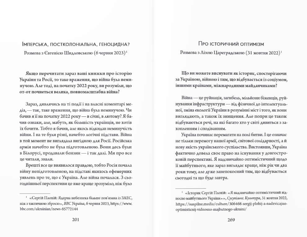 Нова книга Сергія Плохія, одного з найвідоміших українських істориків, професора Гарвардського університету, присвячена насамперед осмисленню Великої війни. Тут зібрано найзначніші інтерв’ю і бесіди автора з 2021 по 2024 рік. Спектр висвітлених тем охоплює ключові актуальні питання, що хвилюють українців і всіх у світі небайдужих до нашого героїчного спротиву: чому агресору не вдався бліцкриг, європейський контекст війни і руйнація світового порядку, чим може закінчитися війна і з якими наслідками тощо. Тверезий погляд історика з перспективи десятиліть і століть здатен послужити цілющою противагою виру пристрастей, що природно супроводжує сьогодні нескінченні виклади й оцінки поточних подій.