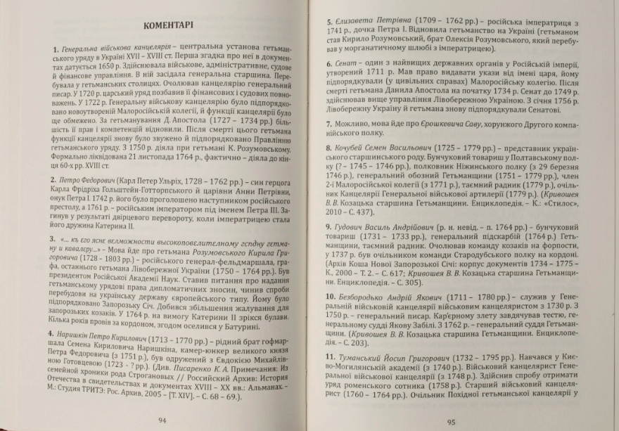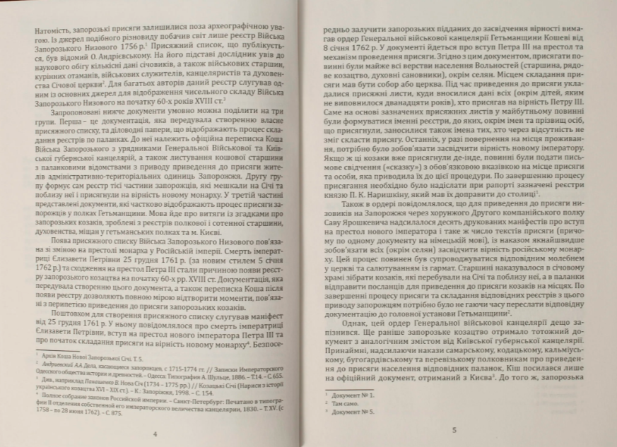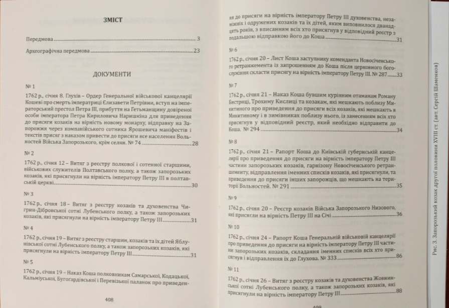 Публікація писемної пам’ятки середини 18-го століття — присяги Війська Запорозького Низового, проведеної в 1762-му році. Текст документа складається з поіменних списків запорізьких козаків з розділенням по куренях, духівництва, служителів канцелярій. Фактично це своєрідний перепис тогочасних жителів українського півдня.
