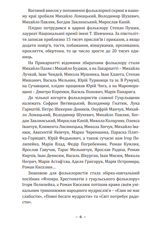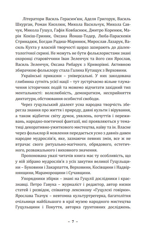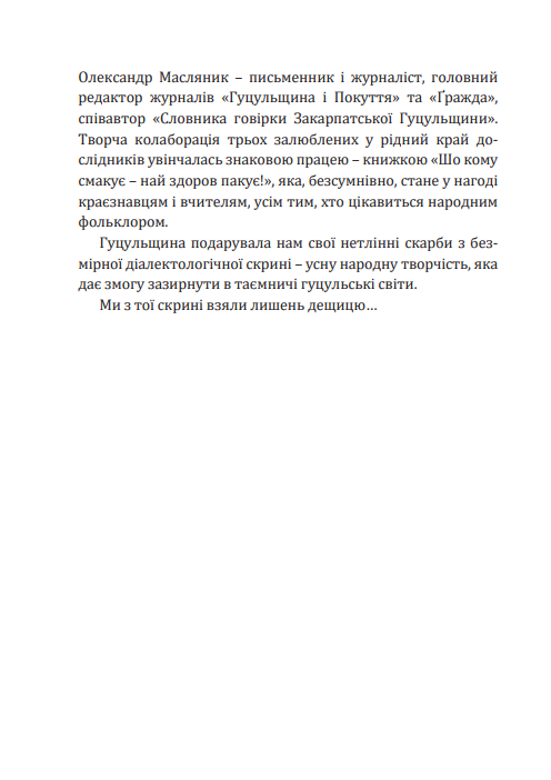 У нашому виданні зібрано кілька тисяч гуцульських прислів’їв, приказок, влучних висловів і повір’їв з усіх закутин великої Гуцульщини – Буковини і Закарпаття, Верховини, Косівщини і Надвірнянщини, Мараморощини і Сучавщини.