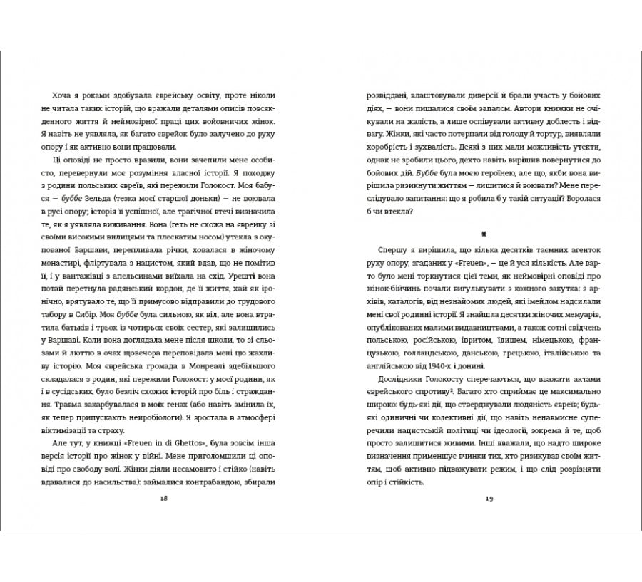 «Світло днів. Нерозказана історія жінок руху опору в гітлерівських гето» — документальний роман про жінок, які допомогли перетворит єврейські молодіжні групи у Польщі на осередки опору для боротьби з нацистами. Деякі з дівчат були ще підлітками, коли стали свідками жорстокого вбивства своїх сімей і сусідів, ґвалтівного знищення їхніх громад. Їм довелося зробити вибір: захист чи порятунок, боротьба чи втеча. Джуді Баталіон, онука поляків, вижилих у Голокост, розповідає історію єврейських дівчат, яким випала доля боротися за життя свого народу від самого початку Другої світової війни аж до кінця ХХ століття — адже війна не закінчується звільненням країн. Це незабутні історії реальних жінок про боротьбу за свободу, виняткову хоробрість, сестринство та волю до життя попри все. Завдяки своїй статі та можливості приховати власну єврейськість, жінкам вдалося унікально пристосуватися до деяких важливих і небезпечних для життя завдань, зокрема виконувати роль кур’єрок. А ще вони підкуповували охоронців гестапо, переховували револьвери в буханках хліба й допомагали розбудувати системи підземних бункерів. Допомагали хворим і навчали дітей, бомбили німецькі залізничні шляхи та підривали електропостачання у Вільнюсі. Одним із джерел натхнення для написання книжки про хоробрість єврейських жінок — збірник мемуарів «Freuen in di Ghettos» («Жінки в гето»), опублікований 1946 року. Авторка дослідила численні документи та мемуари, відшукала родини героїнь своєї книжки, щоб відтворити хід подій, написати історію про незламність та зібрала розповіді безпосередніх учасниць спротиву, аби показати широту й масштаб жіночої відваги та висвітлити надзвичайні досягнення єврейських жінок, чиї подвиги досі лишалися невідомі. За словами Джуді Баталіон, щоб написати книжку, їй знадобилося понад дванадцять років, бо надто складною та дуже особистою виявилась тема твору. “Хоча я роками здобувала єврейську освіту, проте ніколи не читала таких історій, що вражали деталями описів повсякденного життя й неймовірної праці цих войовничих жінок. Я навіть не уявляла, як багато єврейок було залучено до руху опору і як активно вони працювали. Ці оповіді не просто вразили, вони зачепили мене особисто, перевернули моє розуміння власної історії”, – пише авторка. Джуді Баталіон оживляє пам’ять про таких сміливих жінок як: Реня та Сара Кукелки, Фрумка Плотницька, Хайка Клінґер, Бела Хазан, Цивія Любеткін, Хася Беліцька, Хайка Ґроссман та інших, які обрали смертельно небезпечний шлях спротиву, боротьбу за свободу, чиї подвиги досі лишалися невідомі. Книжка «Світло днів» є бестселером New York Times, відзначена Національною єврейською книжковою премією та Канадською єврейською літературною премією.