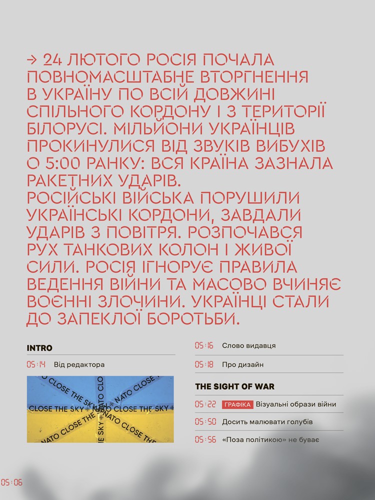 У журналі ви знайдете чимало атрибутів війни. Вибухи й дим, перетини блок-постів між розділами. Нумерація сторінок, що починається з 05:00 24 лютого, коли люди почали прокидатися від вибухів по всій країні. Повітряні тривоги, світломаскування, шрифт, що стрілочкою вказує де укриття.
