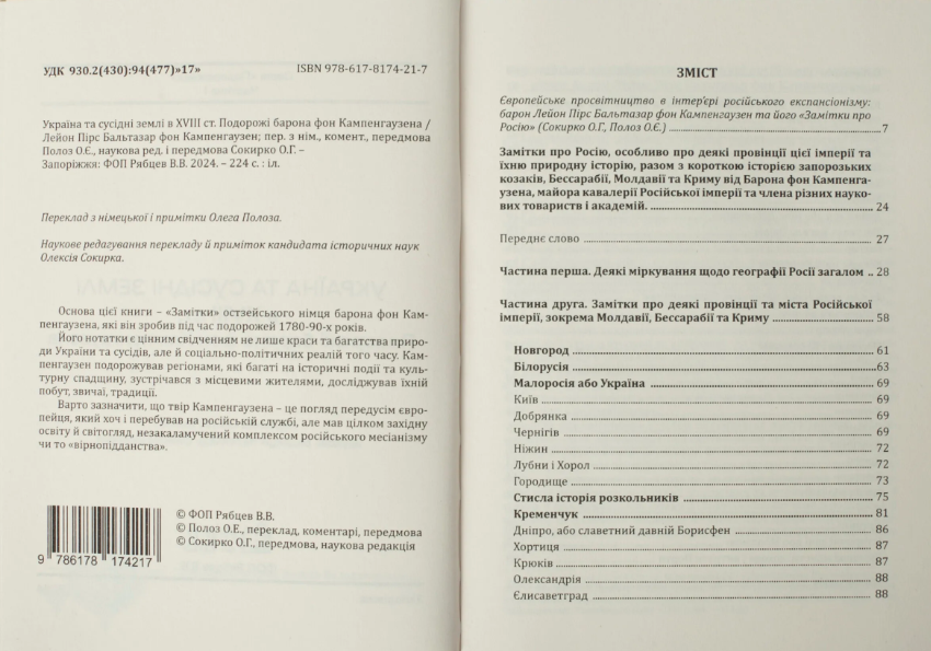 Україна та сусідні землі в XVIII ст. Подорожі барона фон Кампенгаузена (переклад Полоза О.Є., наук.ред. Сокирка О.Г.)