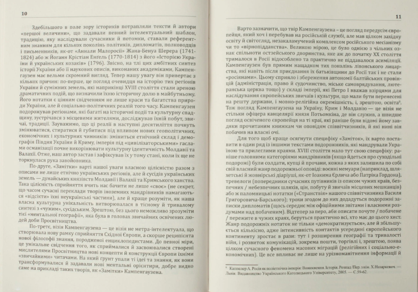 Варто зазначити, що твір Кампенгаузена – це погляд передусім європейця, який хоч і перебував на російській службі, але мав цілком західну освіту й світогляд, незакаламучений комплексом російського месіанізму чи то «вірнопідданства».