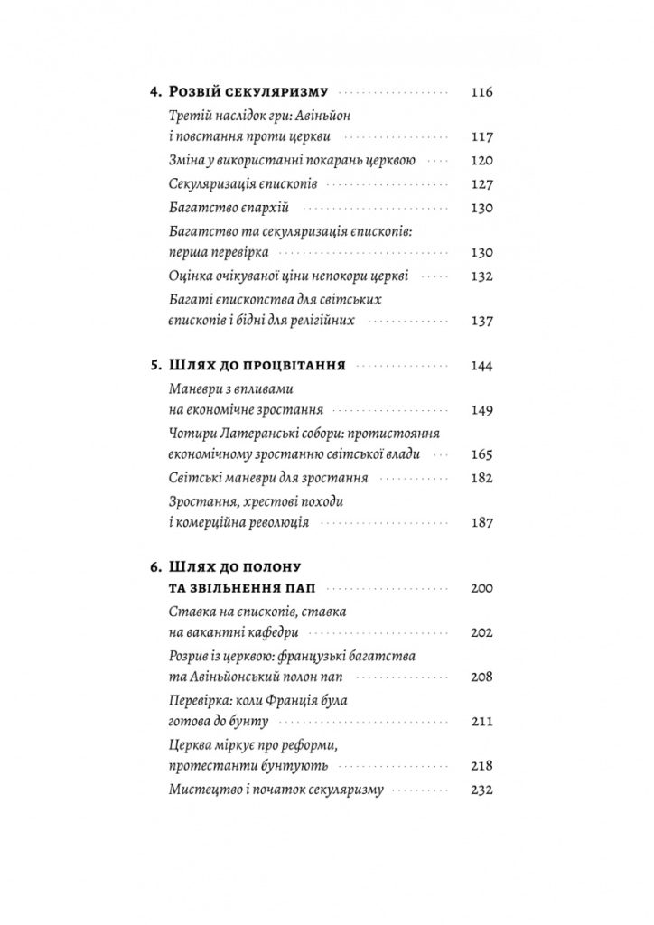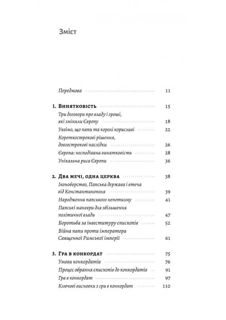 На основі своїх знань у галузі політичного маневрування, укладання угод та теорії ігор професор політології Брюс Буено де Мескіта переносить читача у Середньовіччя і руйнує поширені міфи про те, що західні цивілізації «вільніші, багатші й менш насильницькі» і пояснює, як домовленості між церквою та владою вплинули на перебіг всієї європейської історії й стимулювали економічне зростання цілих регіонів.